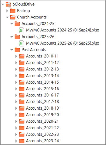 The Methodist year runs from 1st September to 31st August. Martin Way’s financial accounts mirror that and are held and maintained in annual Excel workbooks, each containing several worksheets. All workbooks, past and present, are stored in the Church Accounts folder of our cloud storage, pCloud. A new sub-folder is created at the start of a new year and contains the worksheet for that year. The sub-folder is given a name of the form - Accounts 2025-26 and the workbook within that sub-folder is given a filename of the form MWMC Accounts 2025-26 (01Sep25). This new year’s workbook is created from the previous year’s workbook. The process is described below.
