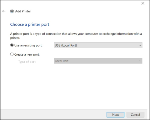 Check “Use an existing port and scroll down the box opposite and select”USB (Local Port”