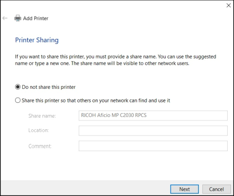 Once installed the next screen asks if the printer is to be shared.