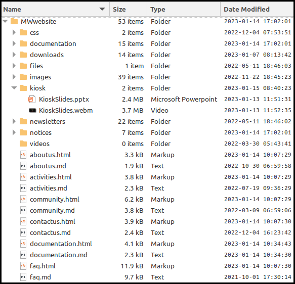 It is a good idea to file like items in sub-folders so that in the above structure, the top-level folder contains all the source Markdown files, their html equivalent plus a batch file (makeMWwebsite.bat) which converts md files to html. The sub folders are: